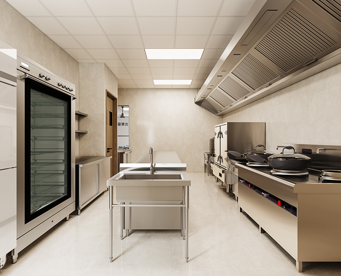 厨房粗细加工间分开,食库主、副食分开,二次更衣分开,加工间、配餐间分开,消毒灯、灭蝇灯、风幕机、油烟机、蒸饭机、电饭锅、灶具、冰箱、冰柜、不锈钢操作台等各类炊具-应俱全,二次更衣室感应水龙头、紫外线灯,下水道灭鼠灭蚊蝇设施都标准设置,以确保学生伙食、 付餐、饮水安全。